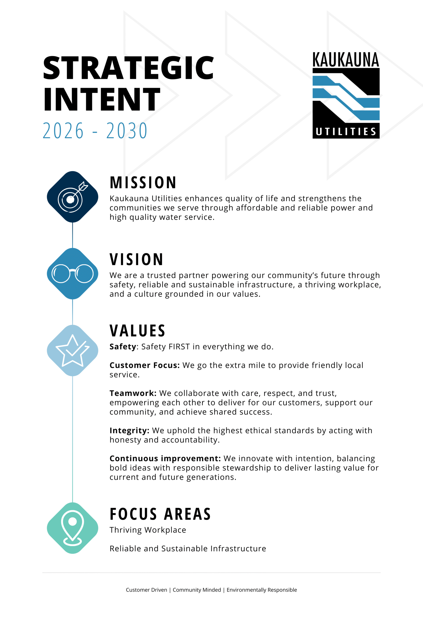 Strategic Intent Beneficial Electrification and Environmental ResponsibilityStrategic Intent See below for an overview of the Kaukauna Utilities 2026 – 2030 Strategic Intent.
